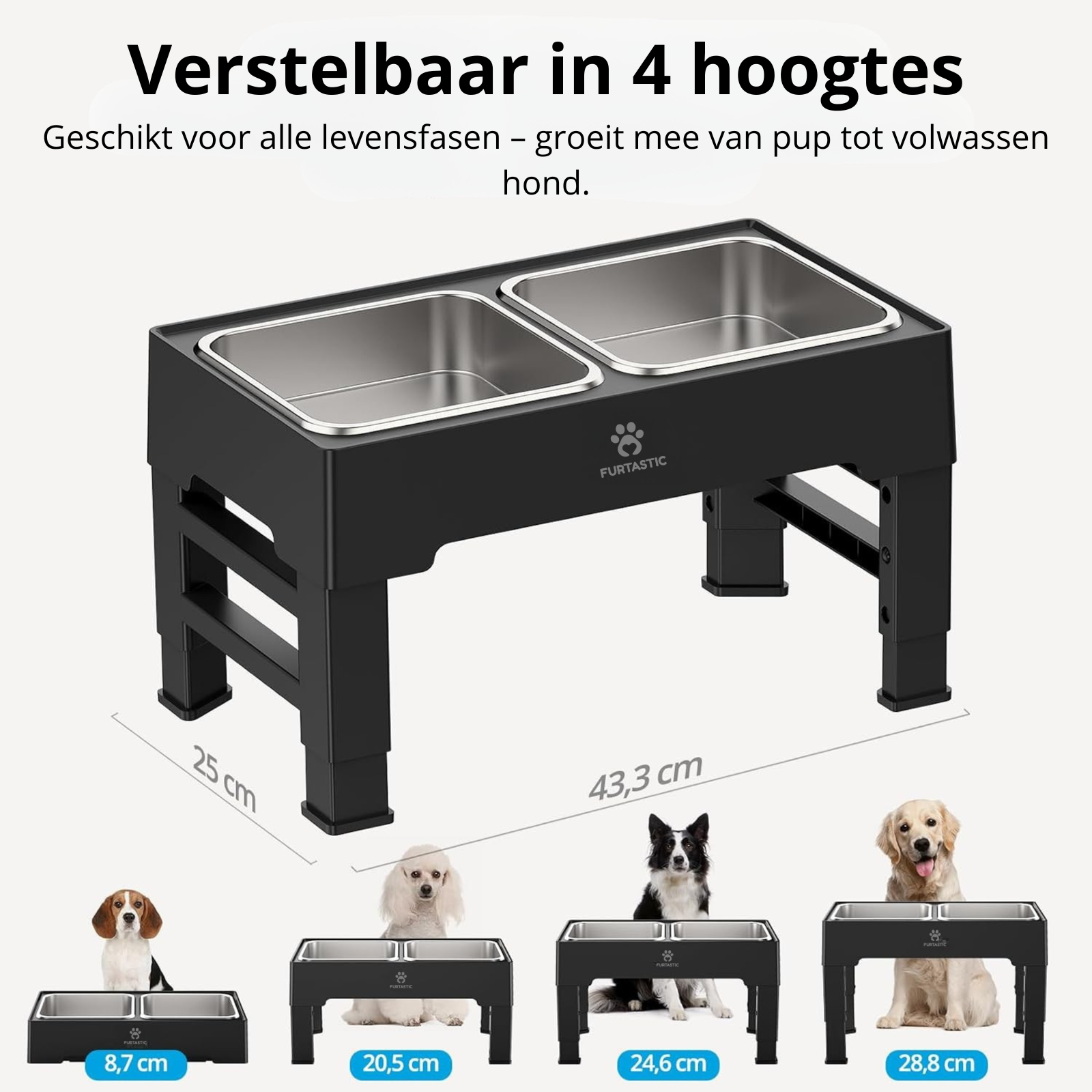 Breng eet- en drinktijd naar een hoger niveau met onze in hoogte verstelbare voerbak van Furtastic. Deze set met twee RVS bakken biedt je hond een comfortabele en gezonde eetervaring. Doordat de standaard in 4 hoogtes verstelbaar is, kan je hond eten in een natuurlijke houding zonder onnodige belasting van nek en gewrichten. Dit is niet alleen prettig voor alle honden, maar vooral ideaal voor oudere honden of viervoeters met gewrichtsproblemen.